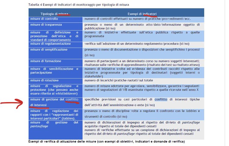 Ebbene, tra queste MISURE ORGANIZZATIVE di prevenzione della corruzione c’è al 10° posto -tra le 12 MISURE ivi previste alla Tabella 4 -la o meglio le misure volte a GESTIRE o MEGLIO PREVENIRE LO SVOLGIMENTO DI UNA PROCEDURA DA PARTE DI SOGGETTO VERSANTE IN SITUAZIONEDI CONFLITTO DI INTERESSI che in quanto tale deve ASTENERSI dal prendere parte al procedimento (v. art. 6bis L. 241/1990), eccole tutte tra cui la predetta n. 10: