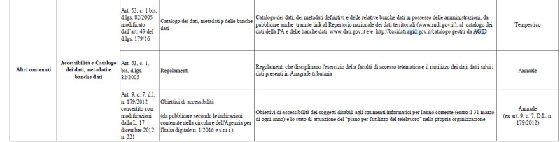 L’ormai troppo datata Determina ANAC 1310/2016 quanto a dati di interesse dell’AGID e non solo (interessano chiunque consulta Amministrazione Trasparente!) prevede allo stato (dal 2016!) sub “Corsia” ALTRI CONTENUTI unicamente la pubblicazione dei SOLI 3 sotto elencati e dati: CATALOGO….REGOLAMENTI….OBIETTIVI DI ACCESSIBILITA’: